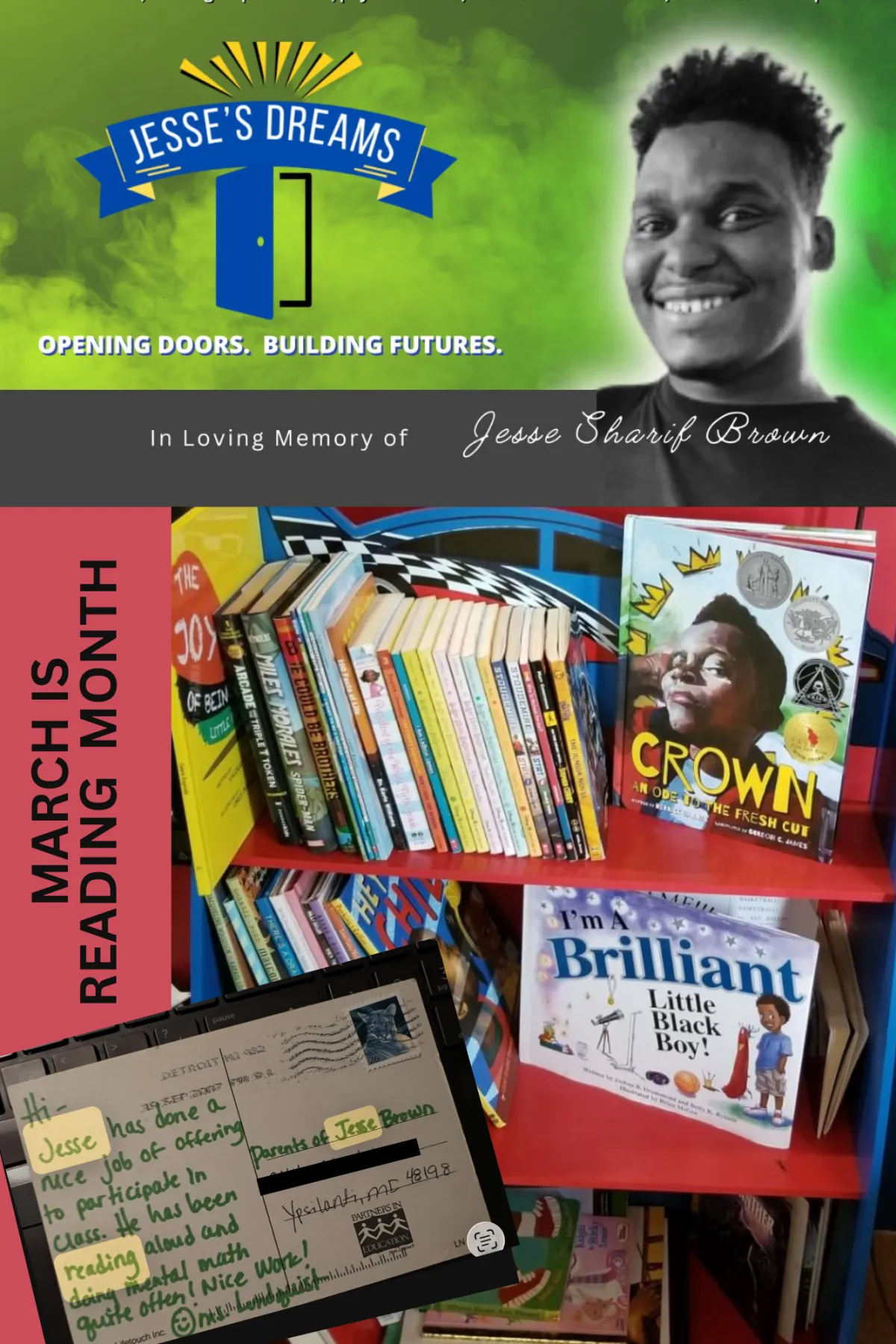 In his honor, through Jesse’s Dreams, we are launching the 29 Homes Reading Initiative.